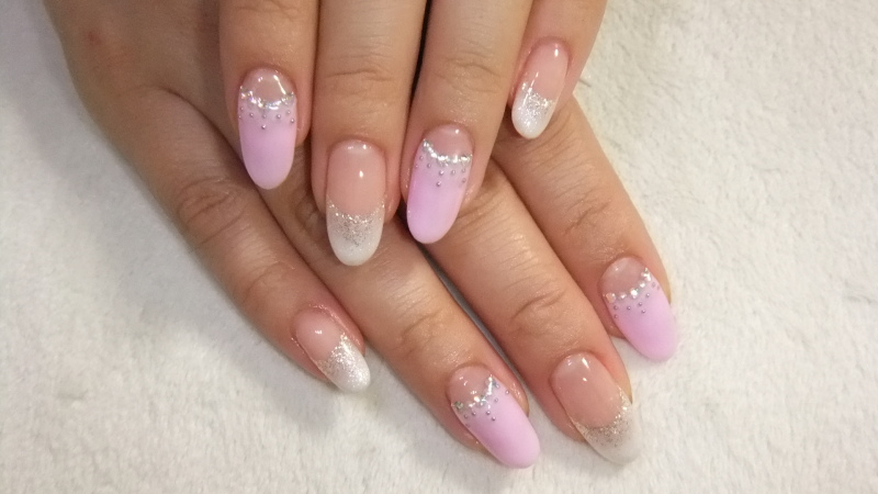 いつもお忙しいさん 今日もお仕事帰りにご来店 おつかれさまです ラメホワイトで涼しげに そしてピンクでかわいくのMIXネイルです